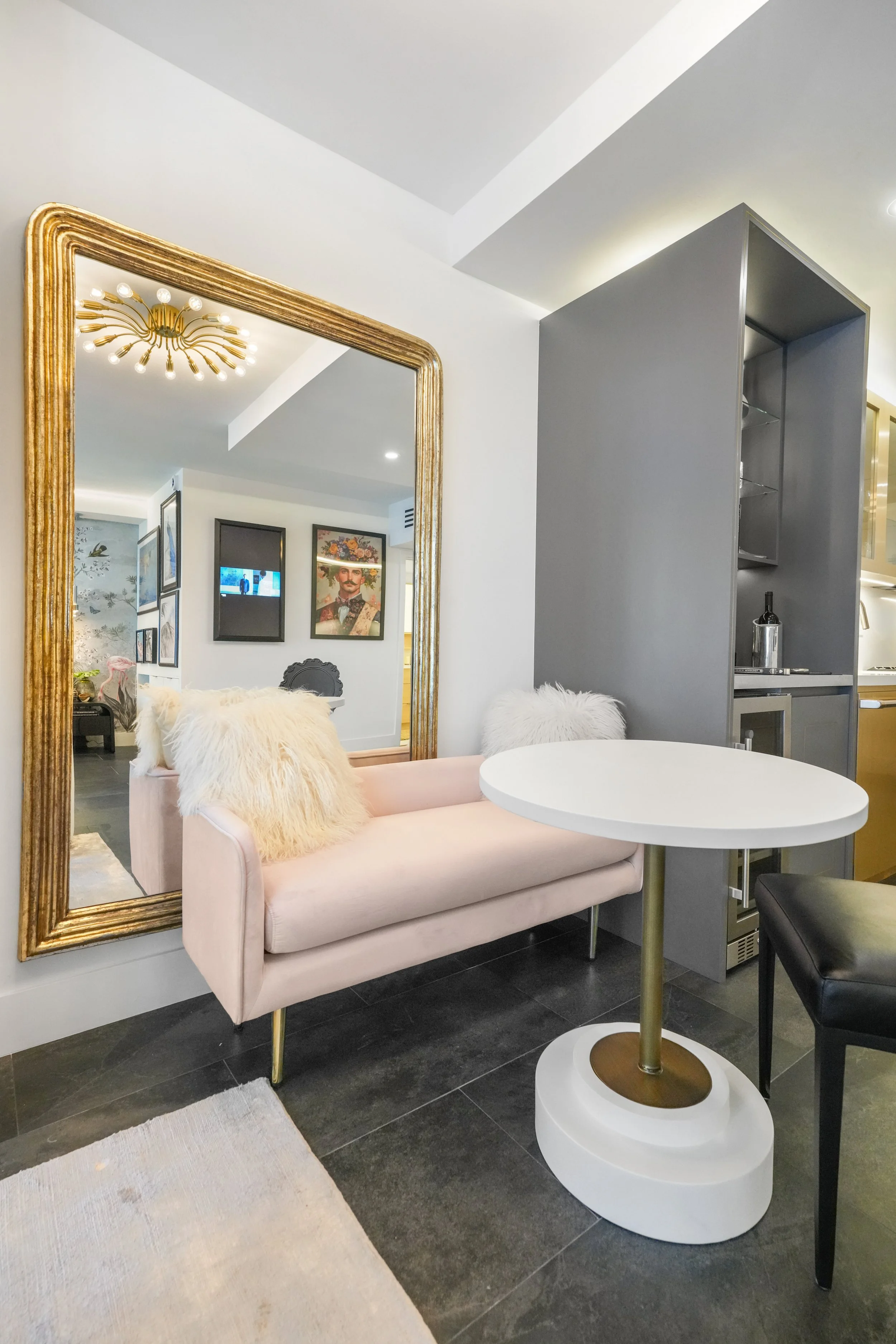 From the hand-painted mural to the metallic accents and curated décor, each detail elevates the character of this space. The result is a visually rich interior that feels personal, modern, and thoughtfully arranged.
