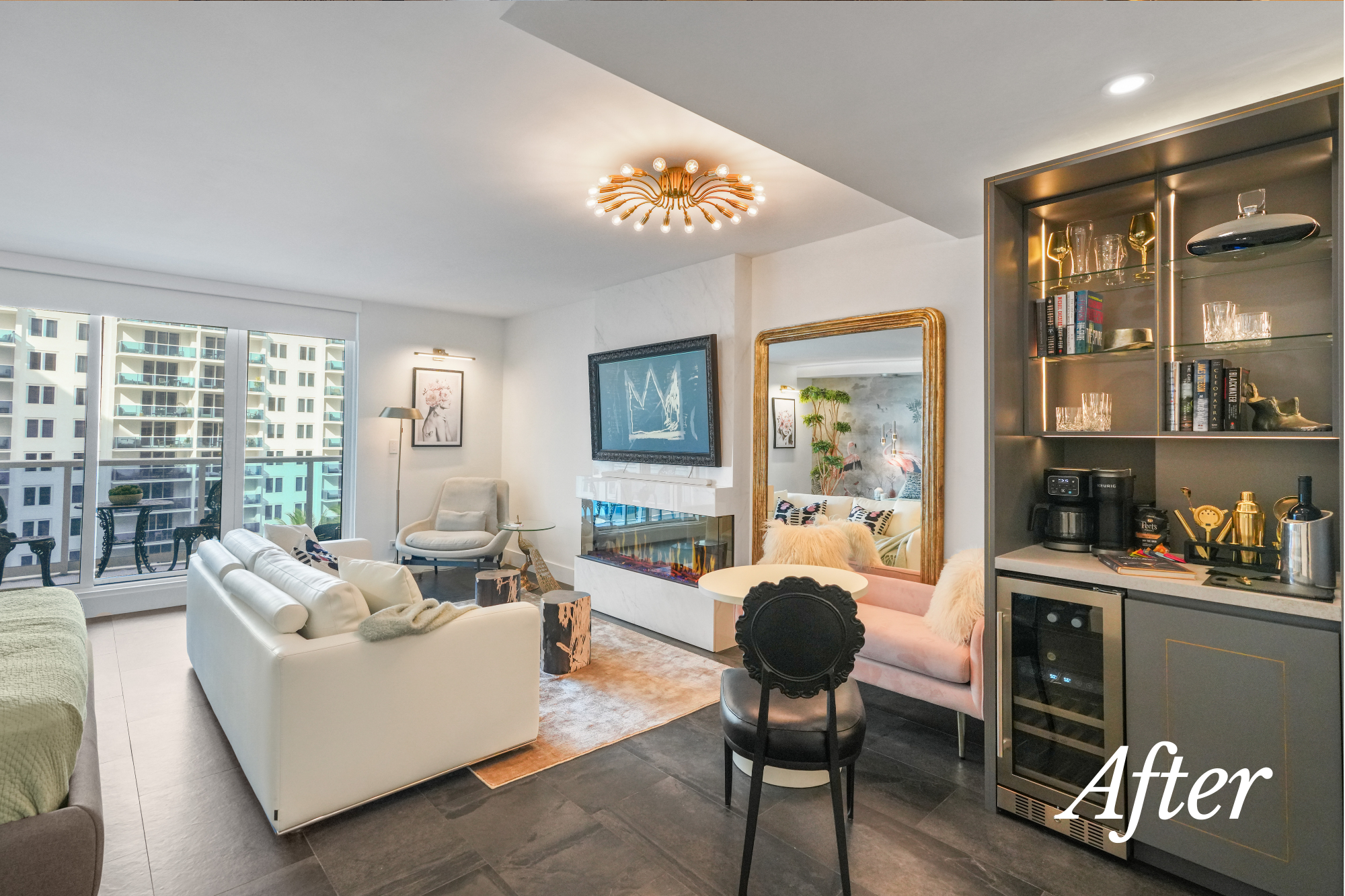 This themed Airbnb is a stylish, bold open-concept space where brushed-gold cabinetry, a sculptural fireplace porcelain wall and curated artwork set the tone for an elevated eclectic city retreat. The layout blends living, lounging, remote working and sleeping into a seamless environment designed for a digital nomad, a stylish couple, or friends seeking an upscale Miami escape.