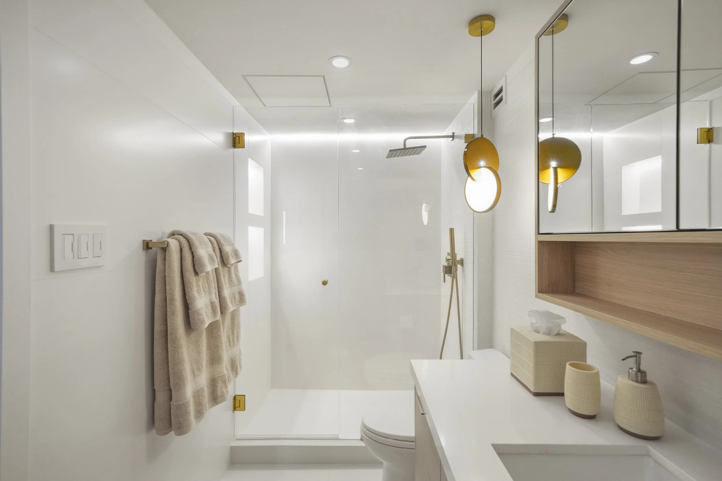The bathroom embraces a calm, organic aesthetic with warm blond oak custom wood cabinetry, soft ambient lighting, and brushed-gold fixtures that elevate the space with subtle sophistication. Our custom cabinet design offers much-needed ample storage for both the large medicine cabinet and the vanity. A spacious glass-enclosed shower and thoughtful styling elements create a serene, spa-like atmosphere—perfect for unwinding after a day in Miami Beach.