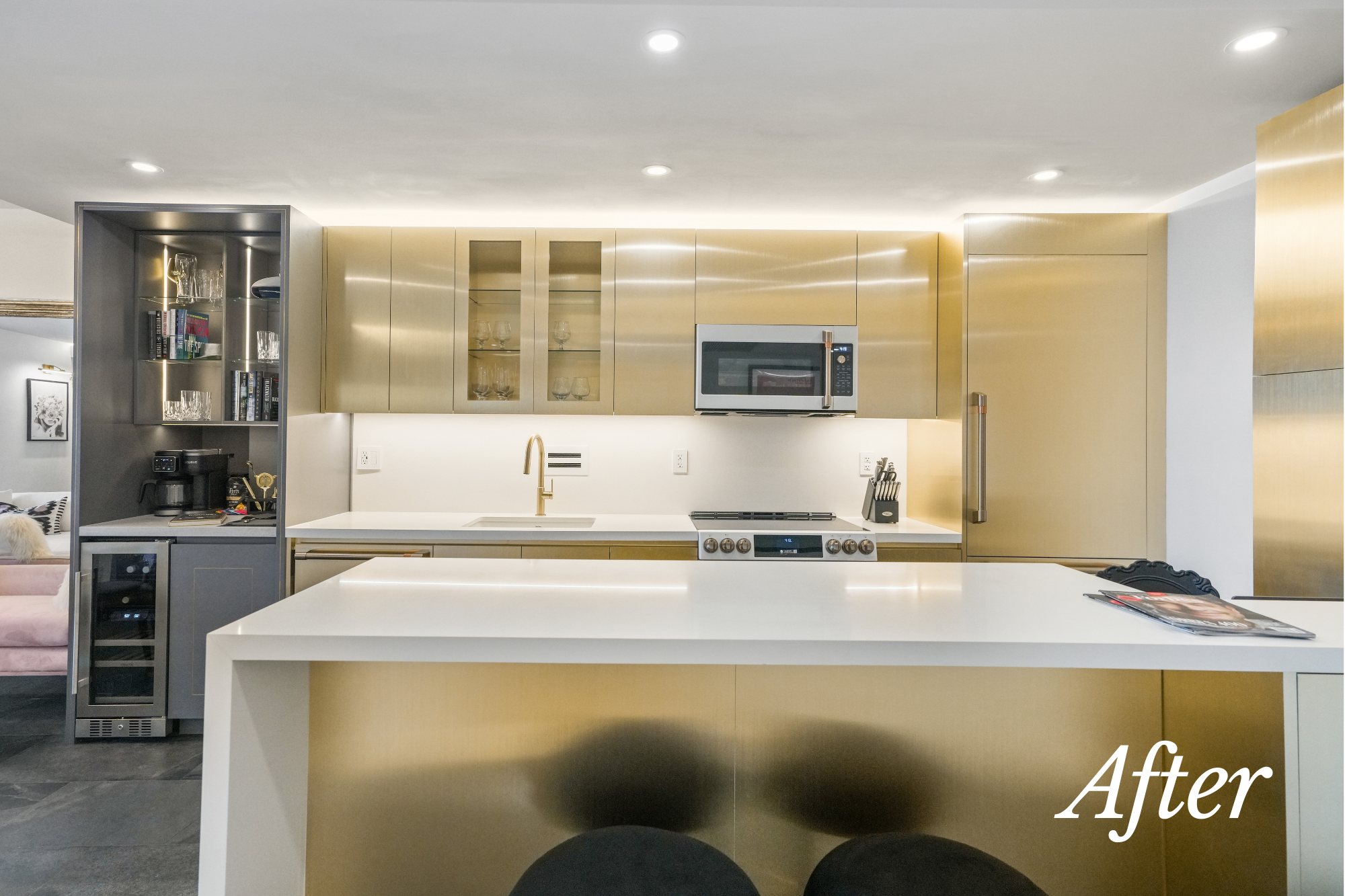 This fully reimagined kitchen pairs metallic gold finishes with clean white surfaces, creating a striking balance between glamour and function. Custom millwork, integrated appliances, and soft under-cabinet lighting deliver a refined yet contemporary atmosphere that elevates the everyday.
