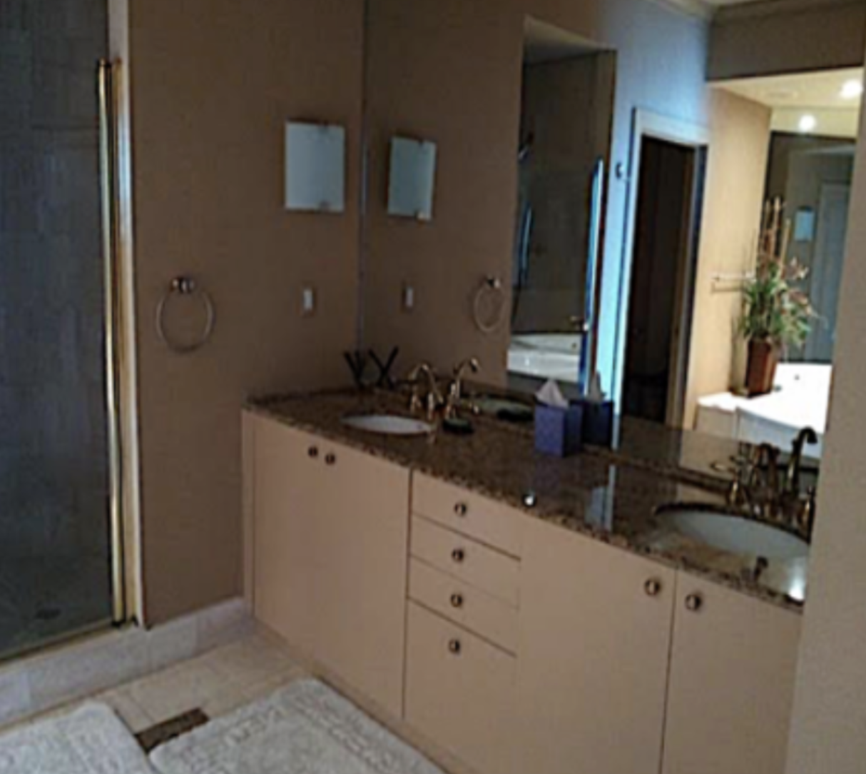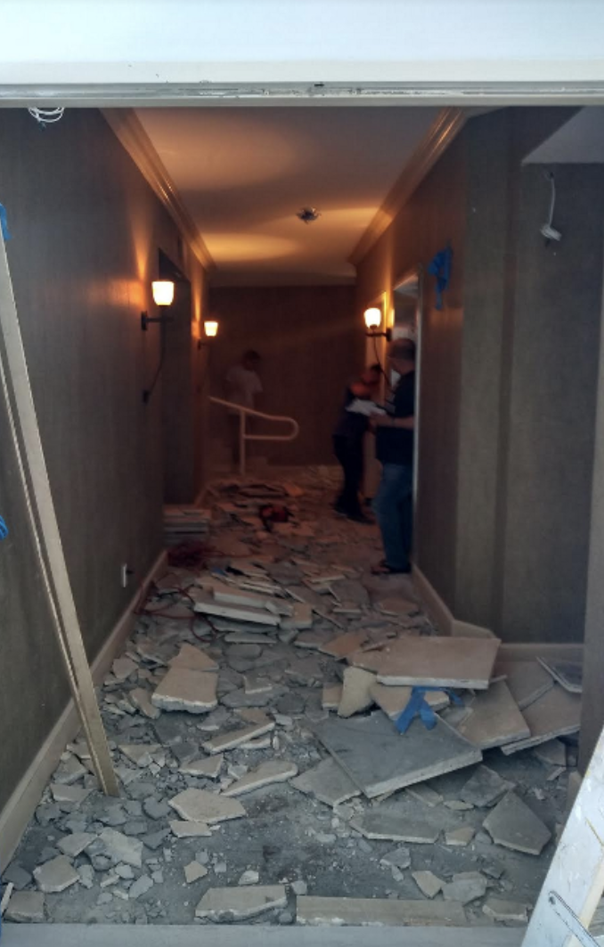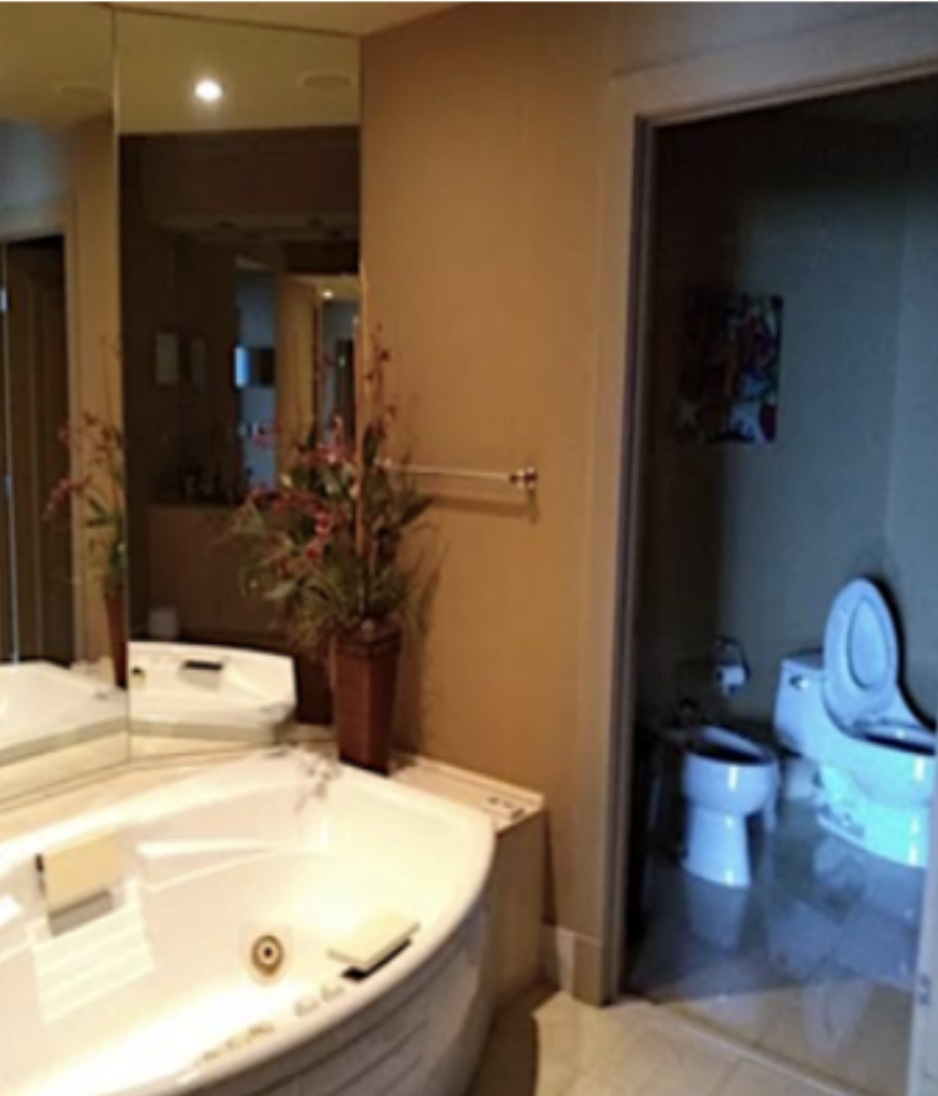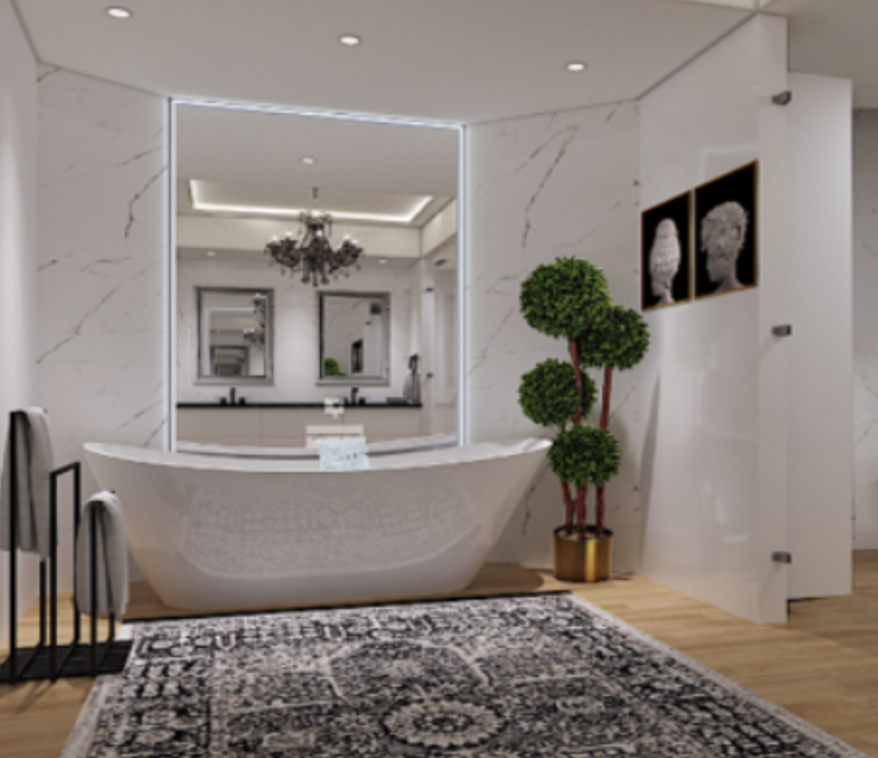The master suite was transformed into a serene retreat through extensive restructuring of the bathroom design and layout and plumbing infrastructure. A frameless glass shower room and enclosed water closet are separated by a custom bench and smart frosted glass panels that shift from transparent to opaque for privacy. The space is anchored by a sculptural soaking tub beneath a dramatic rococo onyx chandelier, creating a romantic focal point against Carrara porcelain slab walls and warm wood flooring. The result is a spa-like environment designed for relaxation after days spent enjoying the oceanfront lifestyle of South of Fifth.